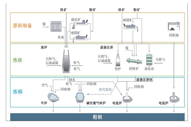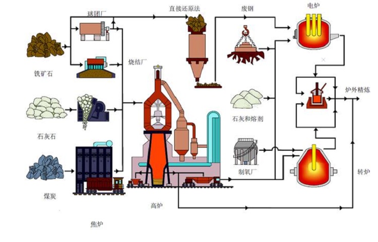目前兩大主要鋼鐵生產(chǎn)工藝:長流程生產(chǎn)工藝以高爐和堿性氧氣轉(zhuǎn)爐為主,它們所用的原料包括鐵礦石、煤炭、石灰石和回收的廢鋼。該工藝生產(chǎn)一噸粗鋼平均使用1.4噸鐵礦石、0.8噸煤、0.3噸石灰石以及0.12噸廢鋼。電弧爐生產(chǎn)工藝主要使用回收的廢鋼及直接還原鐵和電。電弧爐工藝生產(chǎn)一噸粗鋼平均使用0.88噸廢鋼、16千克煤以及64千克石灰石。