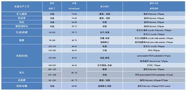 水泥:是將黏土與石灰石配合燒制成塊(熟料)再經(jīng)磨細(xì)而成水硬性膠凝材料。主工藝:兩磨一燒,過程排塵點(diǎn)60幾處,基本全部采用袋除塵器。按5000tpd干法水泥生產(chǎn)線計(jì)算:全廠約需濾料50,000㎡ 。其中:
