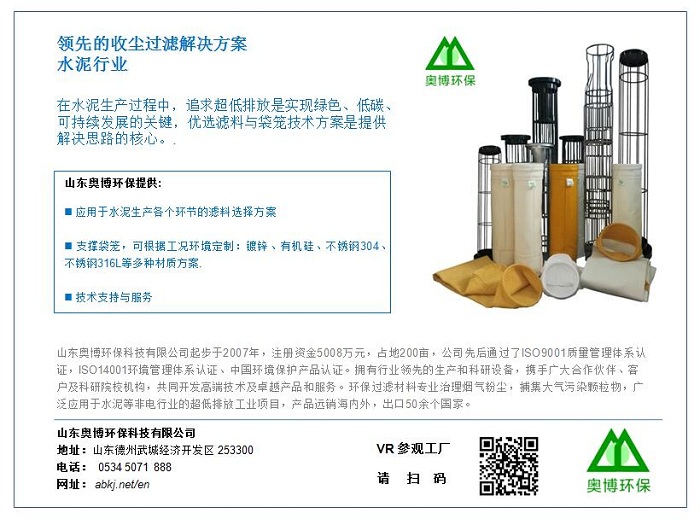 文章詳細(xì)分享了超低排放背景下,在水泥行業(yè)的各個生產(chǎn)環(huán)節(jié)(窯頭、窯尾、水泥磨、煤磨等)的煙氣收塵特性,針對性的提出濾料與袋籠的選用技術(shù)。并提出了納米濾料表面處理技術(shù)的發(fā)展趨勢。山東奧博環(huán)保一直走在濾袋和袋籠發(fā)展的最前沿,不僅關(guān)注當(dāng)下水泥行業(yè)的最新動態(tài),更著眼于幫助水泥等工業(yè)解決未來可能遇到的種種挑戰(zhàn),相信在國內(nèi)外水泥行業(yè)的收塵過濾技術(shù)方面會有更大的提升。