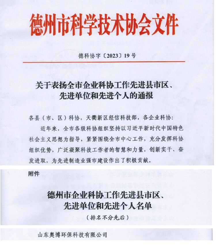 山東奧博環(huán)??萍加邢薰鞠搏@得企業(yè)科協(xié)工作“先進(jìn)單位”榮譽(yù)稱號。