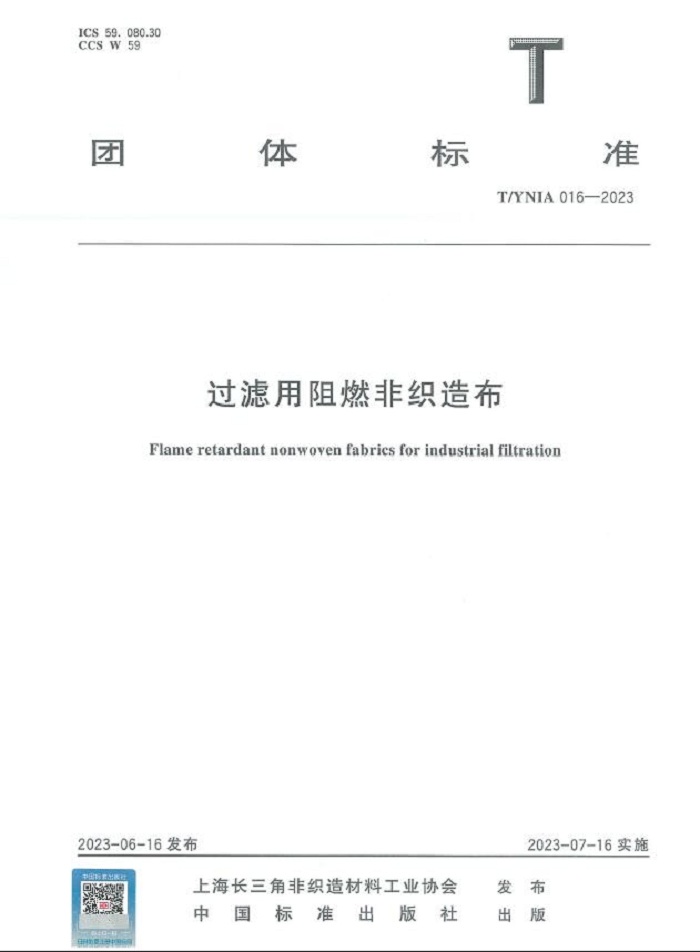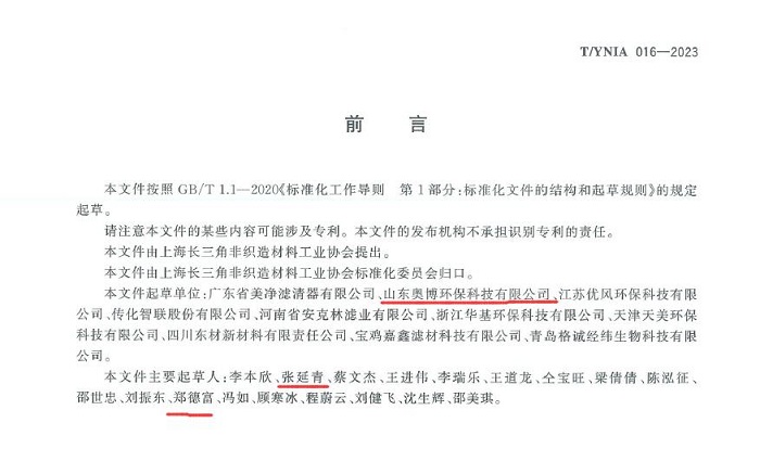 T/YNIA016-2023《過(guò)濾用阻燃非制造布》由上海長(zhǎng)三角非織造材料工業(yè)協(xié)會(huì)權(quán)威發(fā)布,山東奧博環(huán)保科技有限公司為主要完成單位